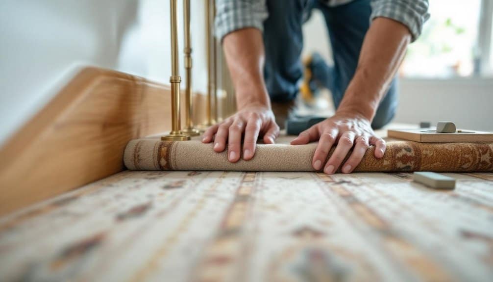 Staircase carpet installation begins with selecting durable materials like nylon or polyester in loop pile construction, followed by choosing 3/8″ to 7/16″ padding with 6-8 lbs/cu ft density. You’ll measure each tread (10-11″), riser (7-8″), and width, adding 10% waste factor. Professional installers prepare surfaces, position tackless strips, and secure carpet using waterfall, cap-and-band, or Hollywood wrap methods. Standard installations take 4-8 hours depending on configuration. The extensive guide below covers special configurations, securing techniques, and long-term maintenance protocols you’ll need to understand.